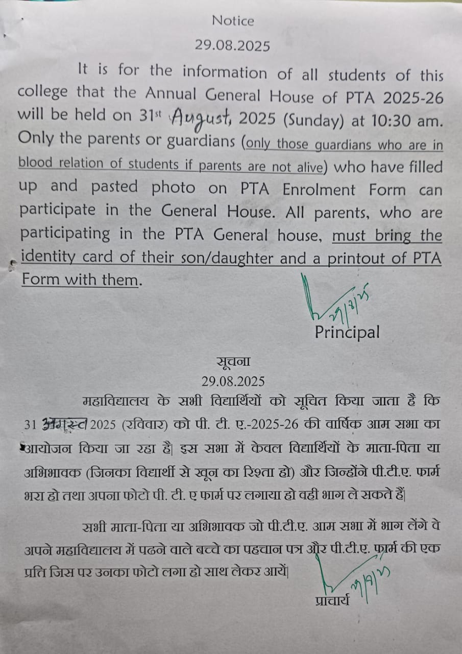 NOTICE : PTA general house, for the session 2025-26 (31.08.2025)